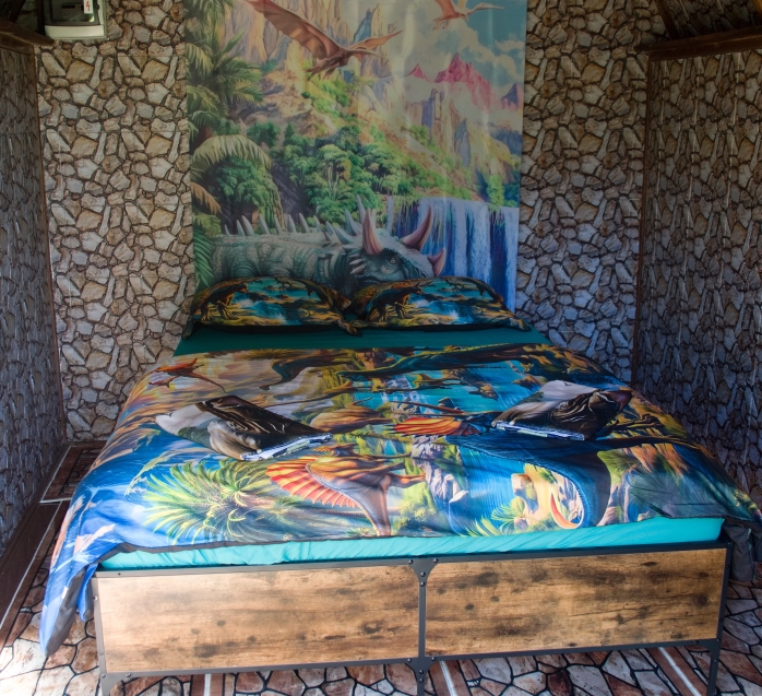 Chatka s motivem dinosaurů, kde máte jurský park na dosah ruky.