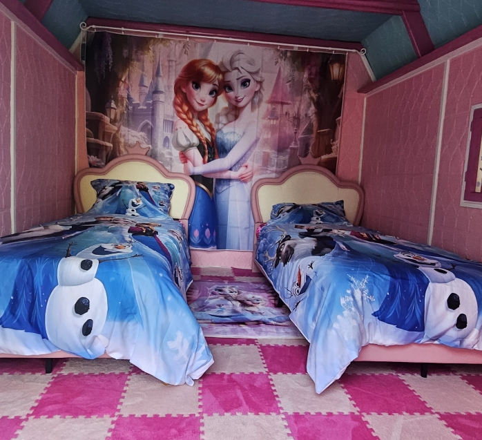 Chatka s motivem Ledového království, kde vládne Elsa s Annou.