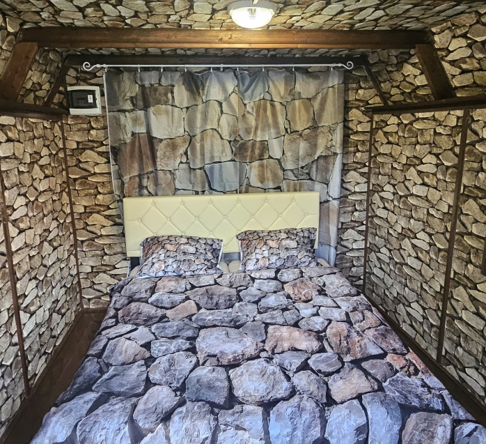 Chatka s motivem kamene, kde doba kamenná stále neskončila.