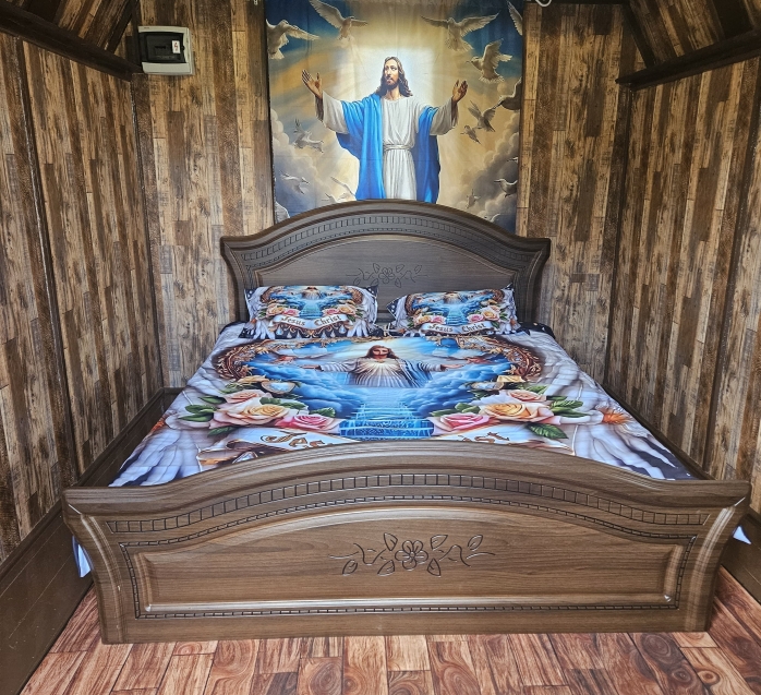Chatka s náboženským motivem, kde na Váš poklidný spánek dohlíží syn Boží.