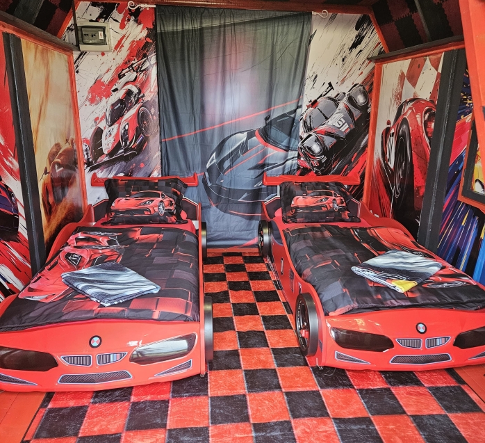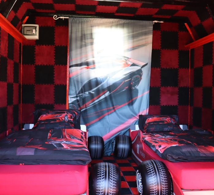 Chatka s motivem závodních aut, kde má klid stále plyn na podlaze.